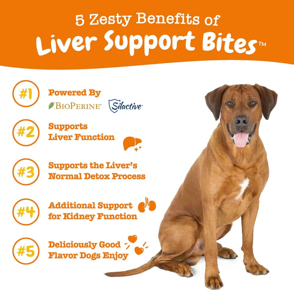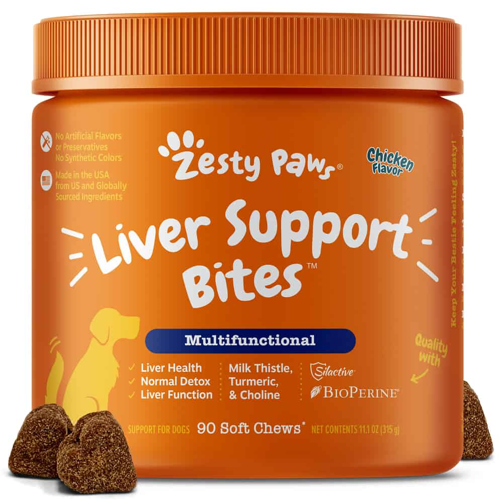 - Zesty Paws Liver Support Bites are grain-free chewable supplements that support canineliver health.