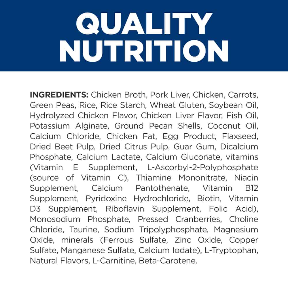 | Chicken Broth, Pork Liver, Chicken, Carrots, Green Peas, Rice, Rice Starch, Wheat Gluten, Soybean Oil, Hydrolyzed Chicken Flavor, Chicken Liver Flavor, Fish Oil, Potassium Alginate, Ground Pecan Shells, Coconut Oil, Calcium Chloride, Chicken Fat, Egg Product, Flaxseed, Dried Beet Pulp, Dried Citrus Pulp, Guar Gum, Dicalcium Phosphate, Calcium Lactate, Calcium Gluconate, vitamins (Vitamin E Supplement, L-Ascorbyl-2-Polyphosphate (source of Vitamin C), Thiamine Mononitrate, Niacin Supplement, Calcium Pantothenate, Vitamin B12 Supplement, Pyridoxine Hydrochloride, Biotin, Vitamin D3 Supplement, Riboflavin Supplement, Folic Acid), Monosodium Phosphate, Pressed Cranberries, Choline Chloride, Taurine, Sodium Tripolyphosphate, Magnesium Oxide, minerals (Ferrous Sulfate, Zinc Oxide, Copper Sulfate, Manganese Sulfate, Calcium Iodate), L-Tryptophan, Natural Flavors, L-Carnitine, Beta-Carotene. |