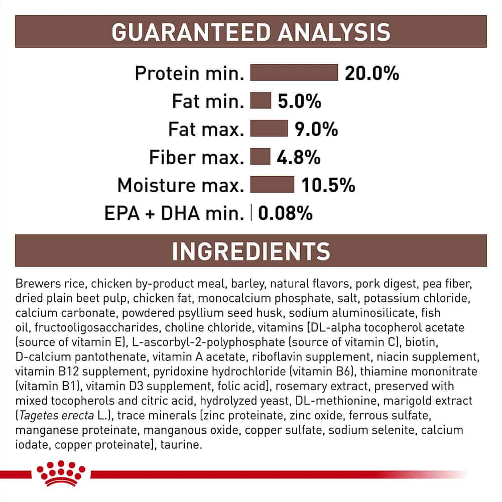 | Brewers rice, chicken by-product meal, barley, natural flavors, pork digest, pea fiber, dried plain beet pulp, chicken fat, monocalcium phosphate, salt, potassium chloride, calcium carbonate, powdered psyllium seed husk, sodium aluminosilicate, fish oil, fructooligosaccharides, choline chloride, vitamins[DL-alpha tocopherol acetate (source of vitamin E), L-ascorbyl-2-polyphosphate (source of vitamin C), biotin, D-calcium pantothenate, vitamin A acetate, riboflavin supplement, niacin supplement, vitamin B12 supplement, pyridoxine hydrochloride (vitamin B6), thiamine mononitrate (vitamin B1), vitamin D3 supplement, folic acid], rosemary extract, preserved with mixed tocopherols and citric acid, hydrolyzed yeast, DL-methionine, marigold extract (Tagetes erecta L.), trace minerals[zinc proteinate, zinc oxide, ferrous sulfate, manganese proteinate, manganous oxide, copper sulfate, sodium selenite, calcium iodate, copper proteinate], taurine. |