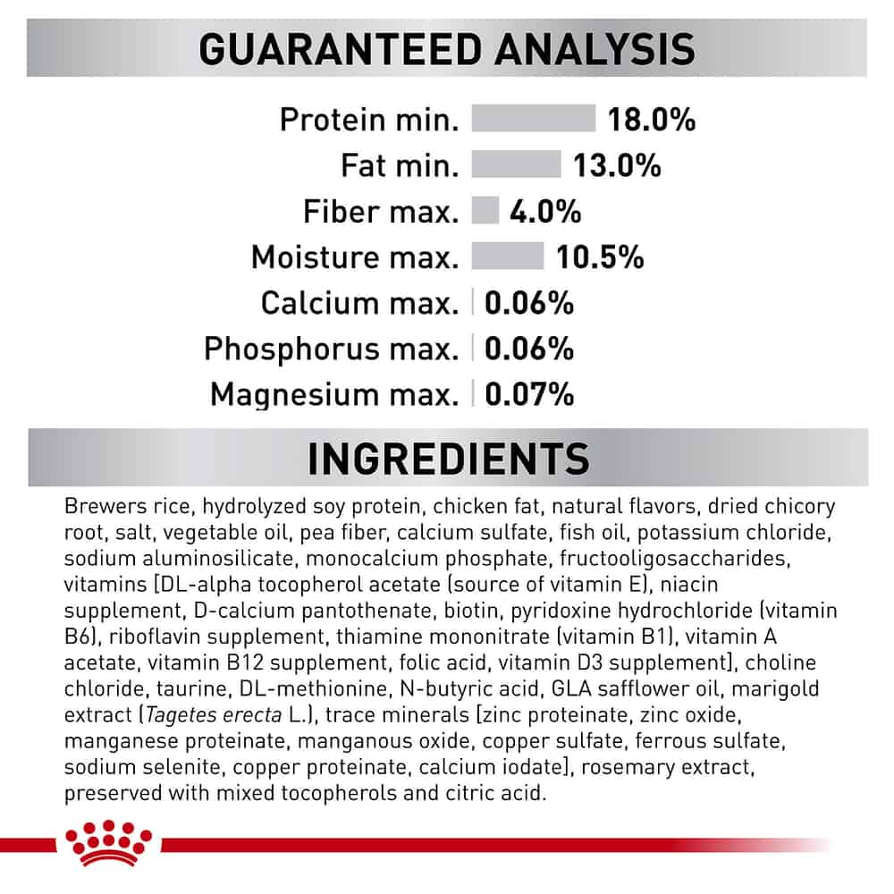 | Brewers Rice, Hydrolyzed Soy Protein, Chicken Fat, Natural Flavors, Dried Chicory Root, Salt, Vegetable Oil, Pea Fiber, Calcium Sulfate, Fish Oil, Potassium Chloride, Sodium Aluminosilicate, Monocalcium Phosphate, Fructooligosaccharides, Vitamins[DL-Alpha Tocopherol Acetate (Source Of Vitamin E), Niacin Supplement, D-Calcium Pantothenate, Biotin, Pyridoxine Hydrochloride (Vitamin B6), Riboflavin Supplement, Thiamine Mononitrate (Vitamin B1), Vitamin A Acetate, Vitamin B12 Supplement, Folic Acid, Vitamin D3 Supplement], Choline Chloride, Taurine, DL-Methionine, N-Butyric Acid, GLA Safflower Oil, Marigold Extract (Tagetes Erecta L.), Trace Minerals[Zinc Proteinate, Zinc Oxide, Manganese Proteinate, Manganous Oxide, Copper Sulfate, Ferrous Sulfate, Sodium Selenite, Copper Proteinate, Calcium Iodate], Rosemary Extract, Preserved With Mixed Tocopherols And Citric Acid. |