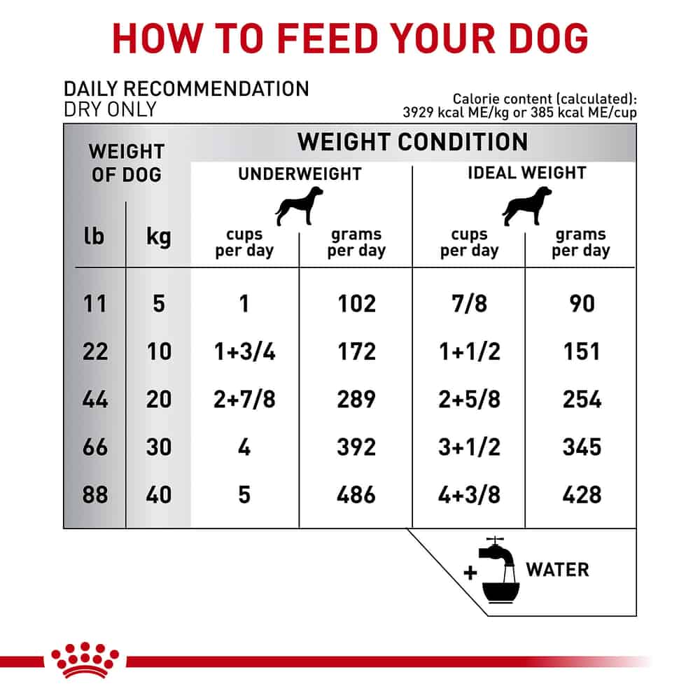 - Feed the daily amount recommended by your veterinarian based on your dog's weight and condition.