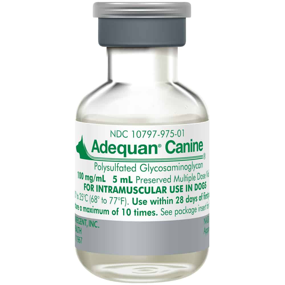 Adequan Canine (for dogs) is used to control symptoms associated with degenerative or traumatic arthritis. It is an injectable polysulfated glycosaminoglycan (PSGAG) and is the only FDA approved product of its type. Adequan has been clinically shown to help treat the disease while giving relief from pain. It modifies the disease cycle, stimulates cartilage repair processes and diminishes joint damage while reducing the pain caused by osteoarthritis. Adequan requires a prescription from your veterinarian. A syringe is needed, but not included in the package.