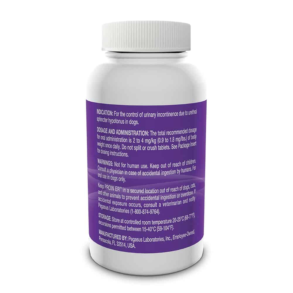 Proin ER is indicated for the control of urinary incontinence due to urethral sphincter hypotonus in dogs. It requires a prescription from your veterinarian. Proin ER provides the same proven efficacy as Proin in extended-release tablets. The patented extended-release technology provides a controlled release mechanism that achieves steady absorption.