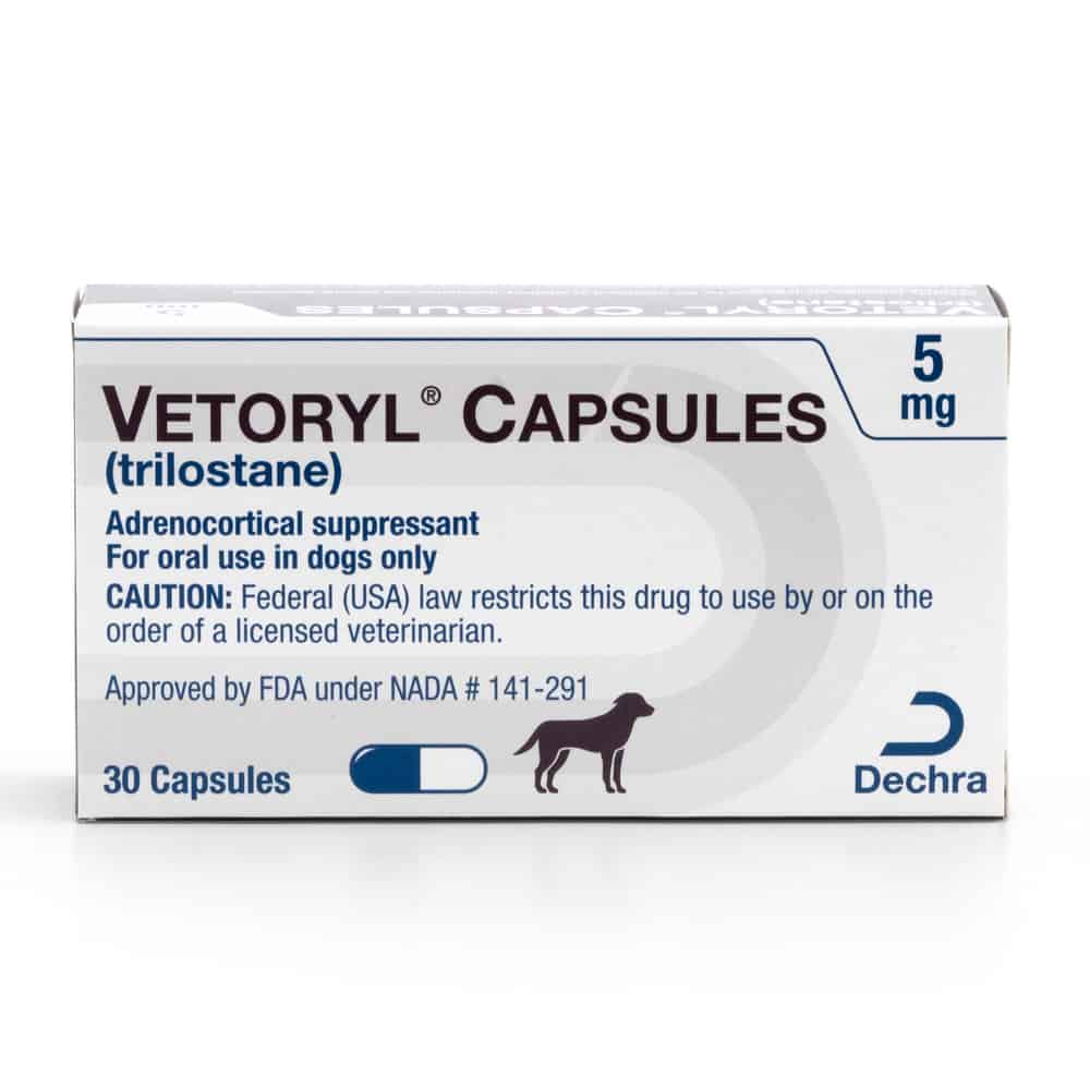 Vetoryl is a prescription medication FDA approved for veterinary use in the treatment of Cushing's Disease. Vetoryl is indicated for use in pituitary-dependent hyperadrenocorticism. Vetoryl also has a Minor Use designation for treatment of Cushing's Disease caused by adrenal tumors. Vetoryl is available as 5mg capsules, 10 mg capsules, 20 mg capsules, 30 mg capsules, 60 mg capsules and 120 mg capsules. The usual initial starting dose to treat Cushing's Disease in dogs is 1.0 to 3.0 mg/lb given once a day based on body weight and capsule size. For dogs weighing 3.8-10 lbs, give one 5 mg or 10 mg capsule once a day. For dogs weighing 10-22 lbs, give one 30 mg capsule once a day. For dogs weighing 22-44 lbs, give one 60 mg capsule. For dogs weighing 44-88 lbs, give one 120 mg capsule. For dogs weighing 88-132 lbs, give one 120 mg capsule and one 60 mg capsule, totaling 180 mg. For dogs weighing over 132 lbs, give the appropriate combination of capsules. Vetoryl should be given with food. After approximately 10 to 14 days, your pet will need to be re-examined and dosage adjustments may be required. Pets may require further re-examination at 30 days, 90 days, and every 3 months thereafter.
