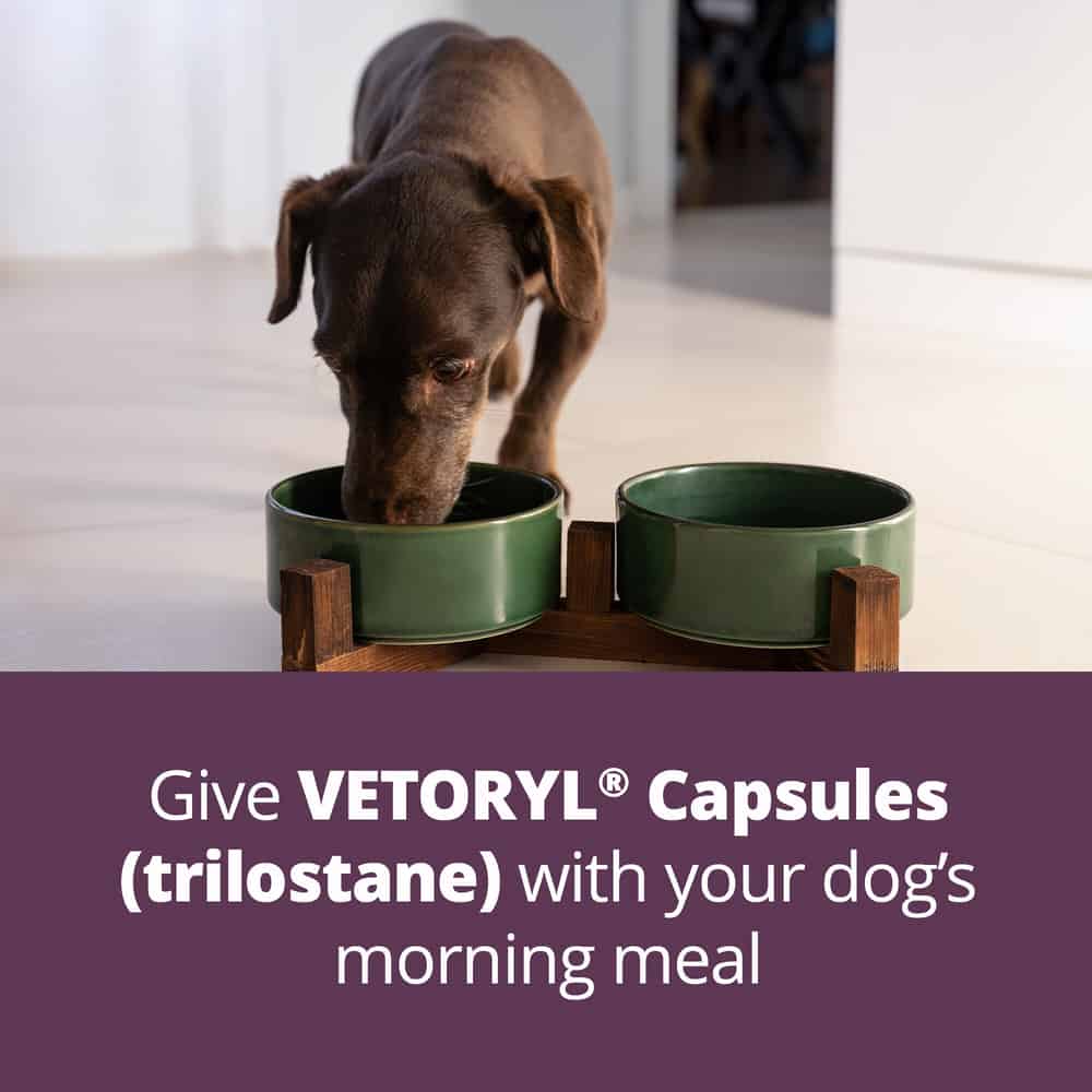 Vetoryl is used to treat dogs with hyperadrenocorticism (Cushing's Disease). Vetoryl (Trilostane) is a competitive inhibitor of the enzyme 3-beta-hydroxysteroid dehydrogenase used in dogs for the treatment of pituitary dependent Cushing's Disease and Cushing's Disease due to adrenocortical tumors. It may be necessary to wait at least one month after discontinuing Lysodren before starting treatment with Vetoryl. Vetoryl requires a prescription from your veterinarian.