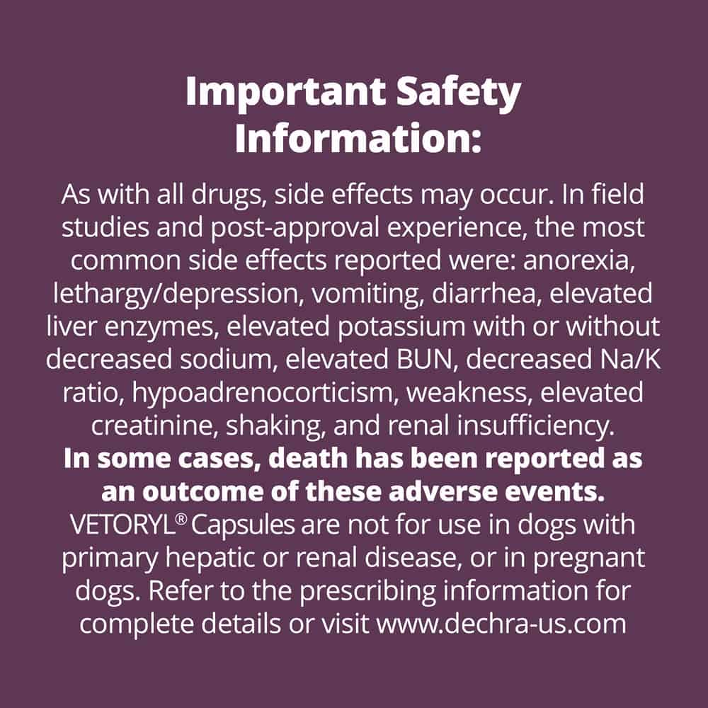 If any of the following serious side effects occur, stop giving Vetoryl and seek emergency veterinary medical attention; an allergic reaction (difficulty breathing; swelling of the lips, tongue or face; hives), severe depression, bloody diarrhea, collapse, or other severe reactions. Other less serious side effects such as unexpected decrease in appetite, vomiting, diarrhea, and lethargy may occur. Other side effects may also occur. Talk to your veterinarian about any side effect that seems unusual or bothersome to your pet.