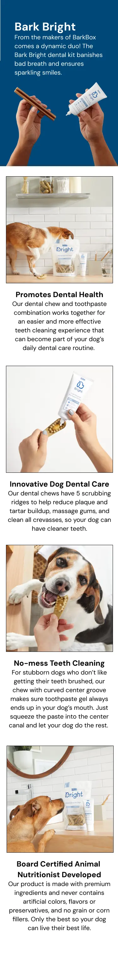- Bark Bright Dental Sticks mimic a toothbrush to help prevent plaque and tartar buildup