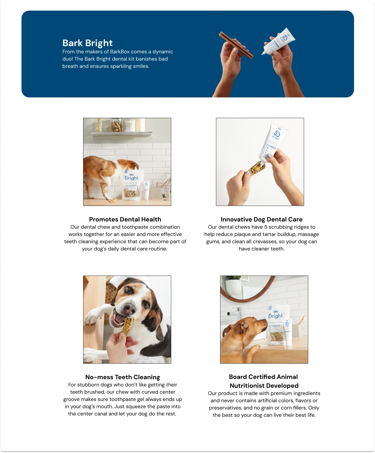 - BARK's powerful chew + toothpaste duo makes it easy to start a dental routine.