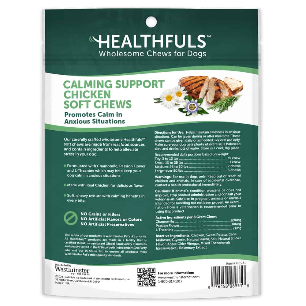 Treat your pup Healthfuls™ Calming Soft Chew Dog Treats, with functional benefits, made in the USA from real food sources and formulated to promote balanced behavior for your dog while treating them to the delicious taste of chicken!
