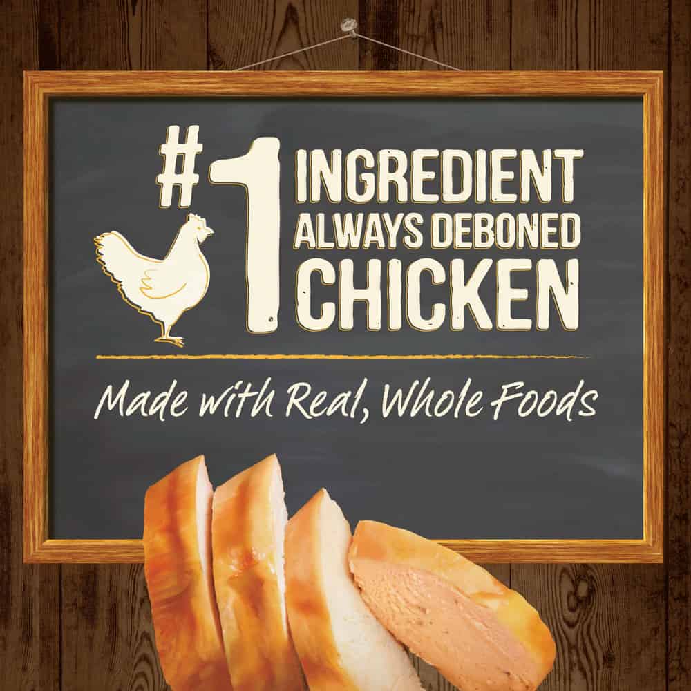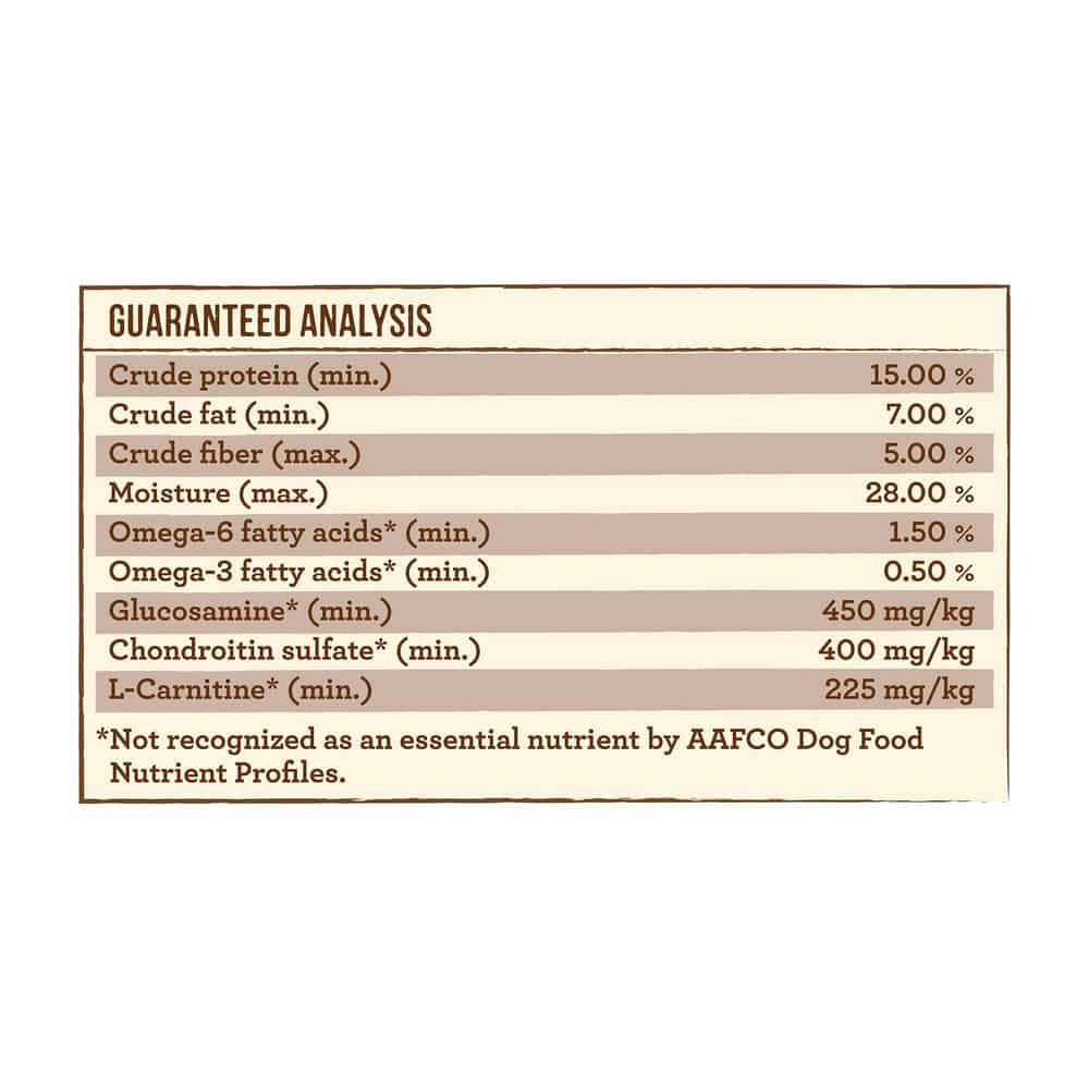 | Ingredients: Deboned Chicken, Potatoes, Peas, Potato Protein, Potato Starch, Organic Cane Molasses, Vegetable Glycerin, Brown Sugar, Cultured Whey, Sunflower Lecithin, Gelatin, Flaxseed, Pea Fiber, Safflower Oil (preserved with mixed tocopherols), Citric Acid (preservative), Salt, Potassium Chloride, Natural Smoke Flavor, Carrots, Apples, Blueberries, Glucosamine Hydrochloride, Chondroitin Sulfate, L-Carnitine, Rosemary Extract. |
