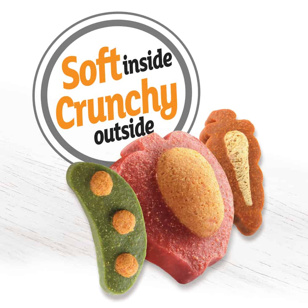 These Purina Snackers treats are oven baked to give them a crunchy exterior and great taste that's full of love. Savory, soft centers provide a delightful contrast to the crunchy outside. These Snackers with peanut butter and cheese flavors are made with wholesome grains and accents of apples, carrots, and peas for a between-meal snack or well-deserved training reward you feel good about serving.