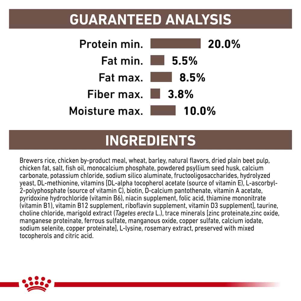 | Brewers rice, chicken by-product meal, wheat, barley, natural flavors, dried plain beet pulp, chicken fat, salt, fish oil, monocalcium phosphate, powdered psyllium seed husk, calcium carbonate, potassium chloride, sodium silico aluminate, fructooligosaccharides, hydrolyzed yeast, DL-methionine, vitamins [DL-alpha tocopherol acetate (source of vitamin E), L-ascorbyl-2-polyphosphate (source of vitamin C), biotin, D-calcium pantothenate, vitamin A acetate, pyridoxine hydrochloride (vitamin B6), niacin supplement, folic acid, thiamine mononitrate (vitamin B1), vitamin B12 supplement, riboflavin supplement, vitamin D3 supplement], taurine, choline chloride, marigold extract (Tagetes erecta L.), trace minerals [zinc proteinate, zinc oxide, manganese proteinate, ferrous sulfate, manganous oxide, copper sulfate, calcium iodate, sodium selenite, copper proteinate], L-lysine, rosemary extract, preserved with mixed tocopherols and citric acid. |