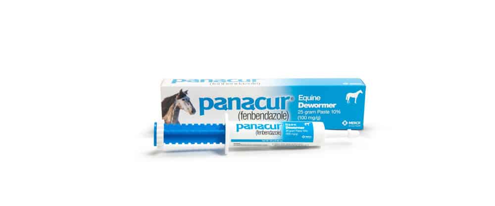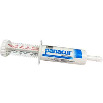 - Panacur Paste Equine Dewormer is administered orally at a rate of 2.3 mg/lb (5 mg/kg) for the control of large strongyles, small strongyles, and pinworms. One syringe will deworm a 1,100 lb horse. For foals and weanlings (less than 18 months of age) where ascarids are a common problem, the recommended dose is 4.6 mg/lb (10 mg/kg); one syringe will deworm a 550 lb horse.