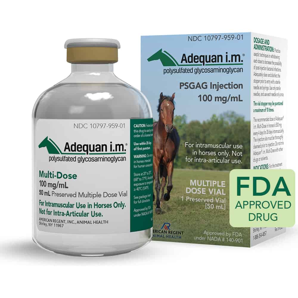 Adequan i.m. Equine helps treat non-infectious degenerative joint disease (DJD) and associated lameness of the carpal and hock joints in horses. It is meant to be administered by intramuscular (IM) injection only (syringe is not included). Adequan i.m. Equine requires a prescription from your veterinarian. Within 2 hours of administration Adequan i.m. Equine reaches peak levels within the joints. Within 48 hours of administration, hyaluronic acid (HA) levels nearly double. Up to 96 hours after administration, Adequan i.m. Equine can be detected in the cartilage and subchondral bone.
